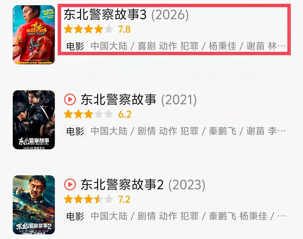 第一部和第二部在某瓣上的评分是6.2和7.2,而这次的《东北警察故事3》则达到了7.8,即将突破8.0大关。
