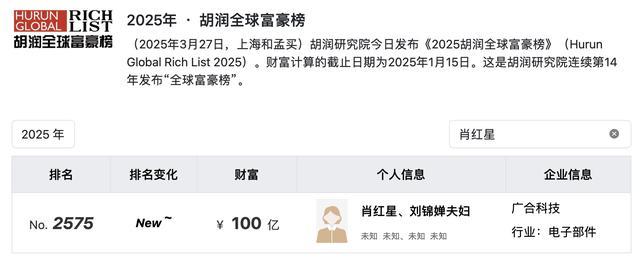 财富层面,肖红星、刘锦婵夫妇以100亿元财富位列《2025年胡润全球富豪榜》第2575名,肖红星成为当年唯一登上该榜单的孝感籍企业家,也被誉为“湖北孝感首富”。