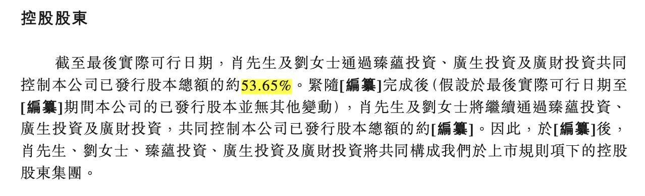 IPO前,肖红星及刘锦婵通过臻蕴投资、广生投资及广财投资共同控制公司已发行股本总额的约53.65%。因此,肖红星、刘锦婵、臻蕴投资、广生投资及广财投资将共同构成公司于上市规则项下的控股股东集团。