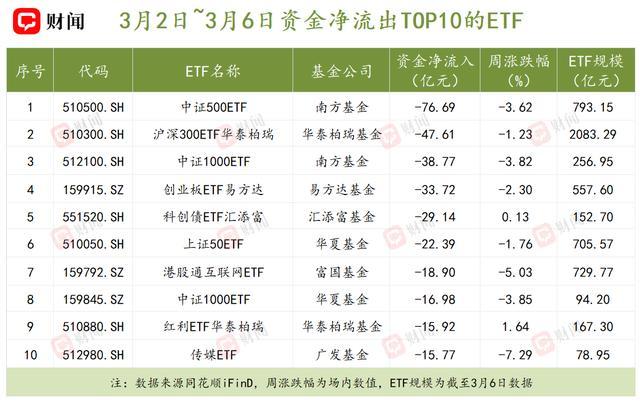 在资金流出方面,宽基ETF仍是主要流出方向。南方基金的中证500ETF、华泰柏瑞沪深300ETF以及南方基金的中证1000ETF位列资金净流出金额前三,分别净流出76.69亿元、47.61亿元和38.77亿元。