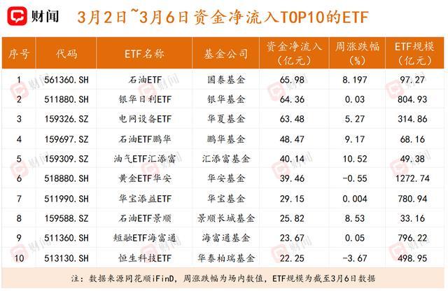 油气相关ETF在价格上涨的同时,也吸引了大量资金布局。在上周资金净流入前十的ETF中,油气类产品占据四席。其中国泰基金的石油ETF吸金65.98亿元,位列榜首,石油ETF鹏华、油气ETF汇添富以及石油ETF景顺分别吸金48.47亿元、40.14亿元和25.82亿元。上述ETF合计吸金180.41亿元。