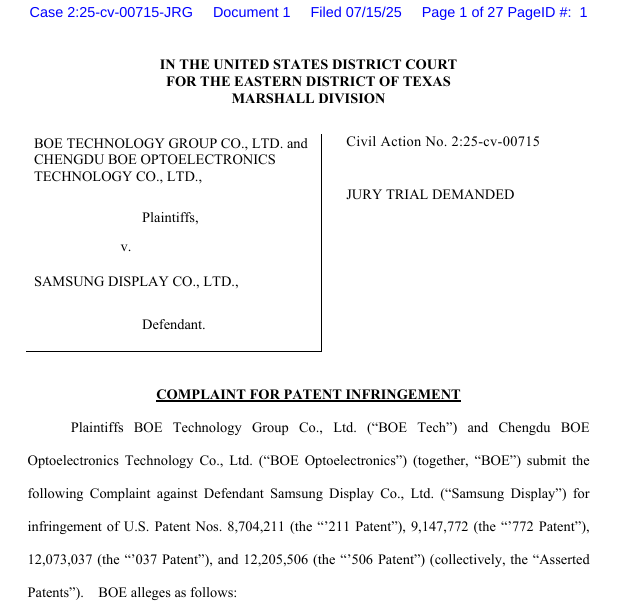 在全球 OLED 显示领域竞争日趋激烈的背景下,京东方与三星显示的专利纠纷持续升级。根据7月17日美国东区德州地区法院的消息,京东方及其子公司成都京东方光电科技(Chengdu BOE Optoelectronics Technology)于15日(当地时间)向三星显示提起了专利侵权诉讼,指控三星显示存在专利侵权行为。这是继今年 5 月底京东方首次向该法院提起四项专利侵权诉讼后,时隔仅两个月发起的又一轮法律反攻,凸显出双方在技术专利领域的激烈博弈。